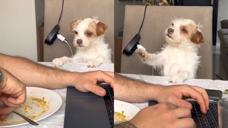 “Com licença, acho que o senhor esqueceu de servir o meu prato”, escreveu Paloma no vídeo, como se fosse a doguinha falando. O homem, por sua vez, não resistiu a carinha da pet e logo dividiu a comida com ela e ainda fez carinho na peluda.