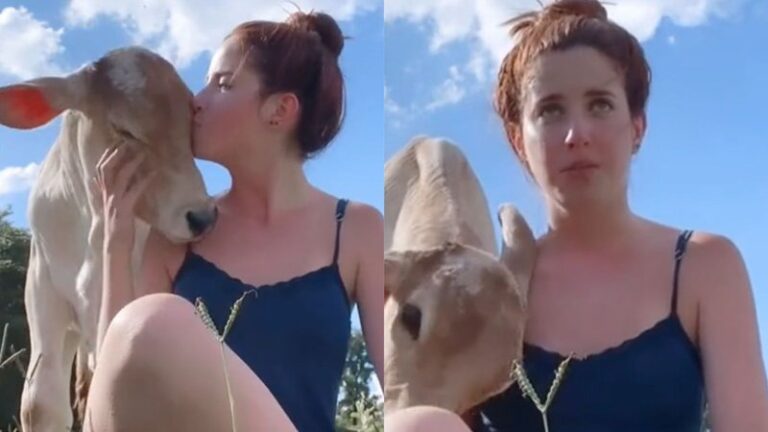 A criadora de conteúdo digital, identificada Bia Orestes, mostrou que teve um ato de coragem para conseguir alguns segundos de carinho com uma bezerrinha. O animal pareceu amar os mimos, mas a sua mãe não ficou tão feliz quanto ele quando assistiu a cena.