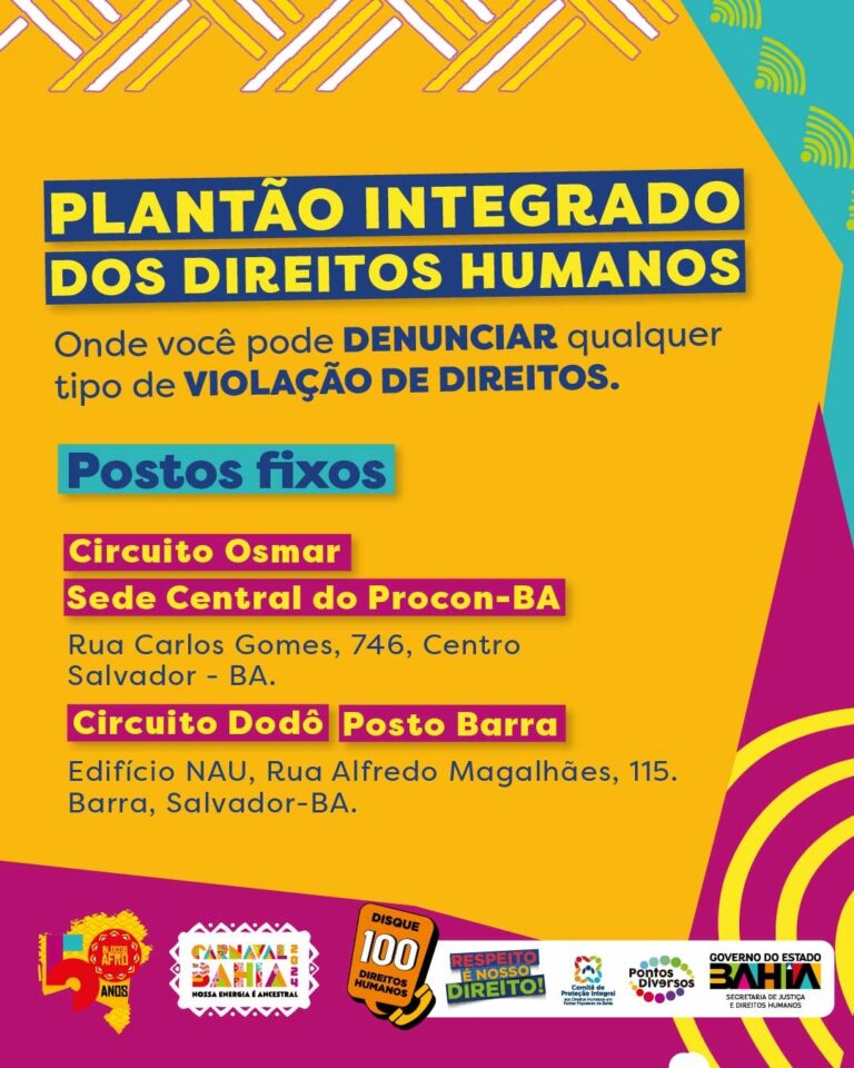 De iniciativa da SJDH, com apoio de órgãos de governo e Sistema de Garantia de Direitos, o Plantão Integrado dos Direitos Humanos terá ponto fixo nos dois postos estratégicos dos circuitos da festa: na sede do Procon-BA, na Rua Carlos Gomes/circuito Osmar, com horário de funcionamento das 09h às 03 da madrugada; e na Barra, no circuito Dodô – no Edifício NAU, Rua Alfredo Magalhães, 115, com funcionamento das 10h à 00h.