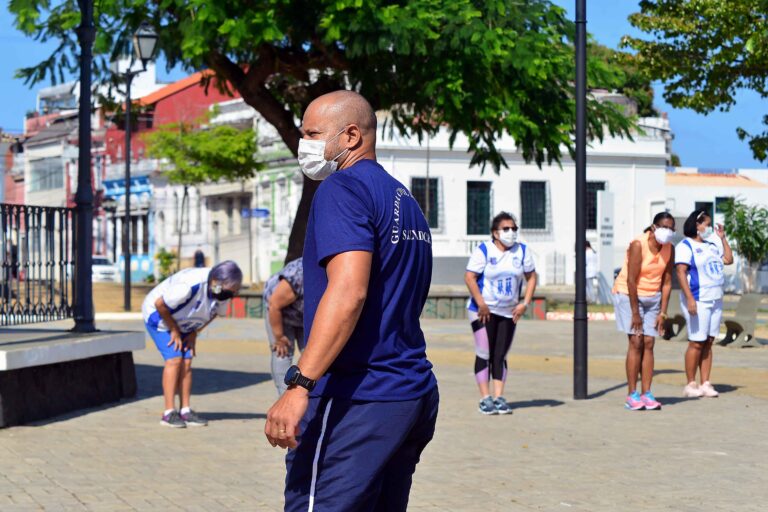A Guarda Civil Municipal (GCM), através da Coordenadoria de Ações e Prevenção à Violência (Cprev), promoveu, na manhã desta quarta-feira (22), uma aula especial ao ar livre com idosos do Santo Antônio Além do Carmo, no Centro Histórico. A ação marcou o retorno – de forma gradativa – das atividades presenciais do trabalho de educação física realizado pela GCM com os moradores da área.