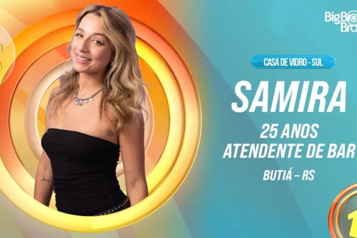 Samira, de 25 anos, foi anunciada como participante do grupo Pipoca. Ela veio da Casa de Vidro da região Sul, dinâmica que permitiu que os espectadores escolhessem quem serão os próximos integrantes do BBB 26. Natural de Butiá, no Rio Grande do Sul, cresceu em Gravataí, mas hoje vive em Imbituba, Santa Catarina.